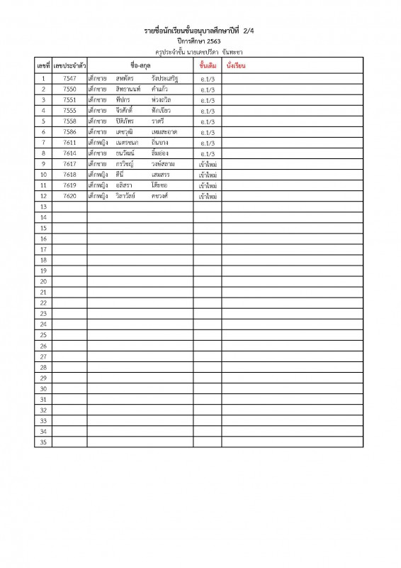 รายชื่อนักเรียนชั้น อนุบาล 1-2 ปีการศึกษา 2563 ณ 03/06/2563